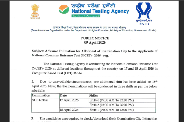 NTA NCET exam city intimation slip 2026 released at nta.nic.in: Direct link to download here NCET city intimation slip 2026: The National Testing Agency (NTA) has released the exam city intimation slips for the National Common Entrance Test (NCET) 2026. The examination, which serves as the gateway to the 4-year Integrated Teacher Education Programme (ITEP),…